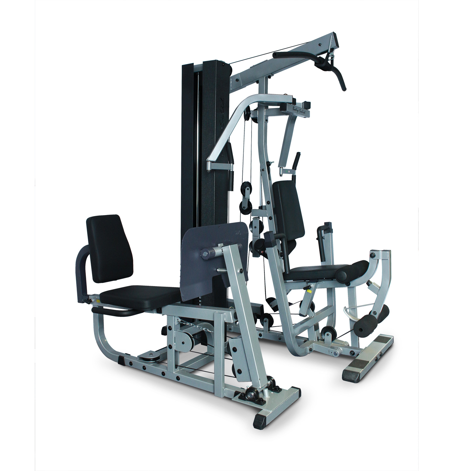 We’ve combined the best-selling GEXM2000 Multi-Gym with the optional Leg Press Attachment to offer you even more workout flexibility. Featuring a simple, space-saving design, the stylish Body-Solid GEXM2000 Multi-Gym delivers a wide option of exercises to strengthen, build and tone your entire body. At just 4 x 5 foot, it fits comfortably into most rooms while the 210lbs weight stack, shrouded for maximum safety, guarantees workouts to take your performance to the next level. Delivering on comfort, the GEXM2000 features an adjustable seat and back pad, allowing you to tweak for a custom fit. The weight selector pin is within easy reach too so you can pick your desired weight with minimum fuss. The bench press arms are also fully adjustable to ensure you get the exact right positioning for you. There are dozens of exercises to be performed on this multi-gym. Designed with free weights in mind, flys have never been more precise. Reach up for the Ab Strap, pull it over your shoulders and crunch your way to impeccable abs, or wrap your legs around the oversized foam rollers of the Leg Extension / Leg Curl and blast those quads. Spin around, reach up and take hold of the Lat Bar and perform a set of Lat-blasting pull downs. Other exercises include seated rows, triceps press downs, arm curls, leg curls, bent over rows, inner / outer thighs and many more. The included Leg Press (grey) attaches to the multi-gym, allowing you to add this highly effective exercise to your programme. Featuring Body-Solid’s exceptional high quality design, a sealed pillow block ball bearing system delivers exceptional durability and friction-free performance while excellent upholstery ensures comfort. Operating on a 2 to 1 ratio, it transforms your 210lb weight stack into 420lbs of resistance. Ideal for working your quads, glutes and calves.